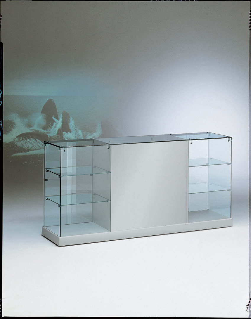 Vitrina pult od kaljenog stakla, lijevo i desno stakleni dio s vratima i bravicom, 2+ 2 police, središnji dio ormarić s 2 ladice, postolje s ogledalom i na kotačima.