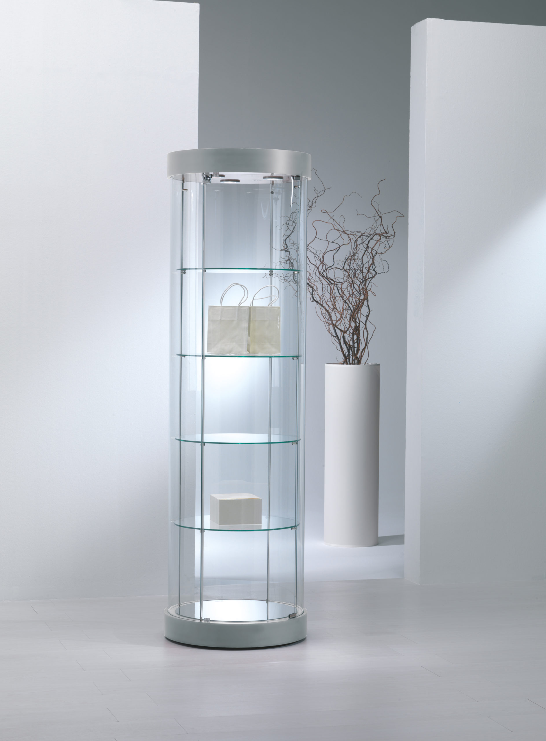 Vitrina okrugla od kaljenog stakla, krovna LED rasvjeta (3 kom), 1 vrata s bravicom, 4 police visinski podesive, postolje s ogledalom i na kotačima.
