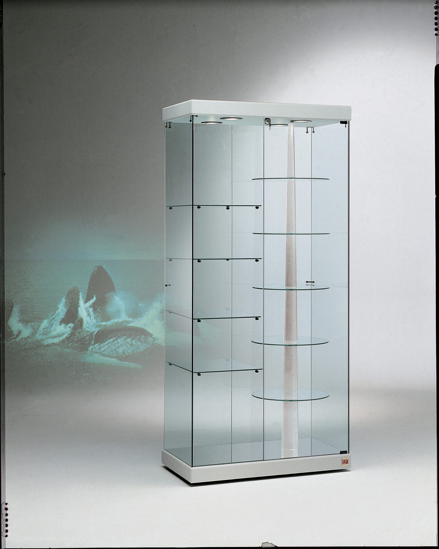 Vitrina od kaljenog stakla, krovna LED rasvjeta (4 kom), 1 vrata s bravicom, 4 fiksne police + rotirajući stup s 5 polica, postolje s ogledalom i na kotačima
